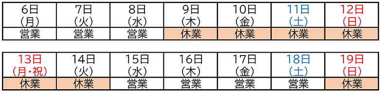 10月臨時休業のお知らせ(9日~14日)